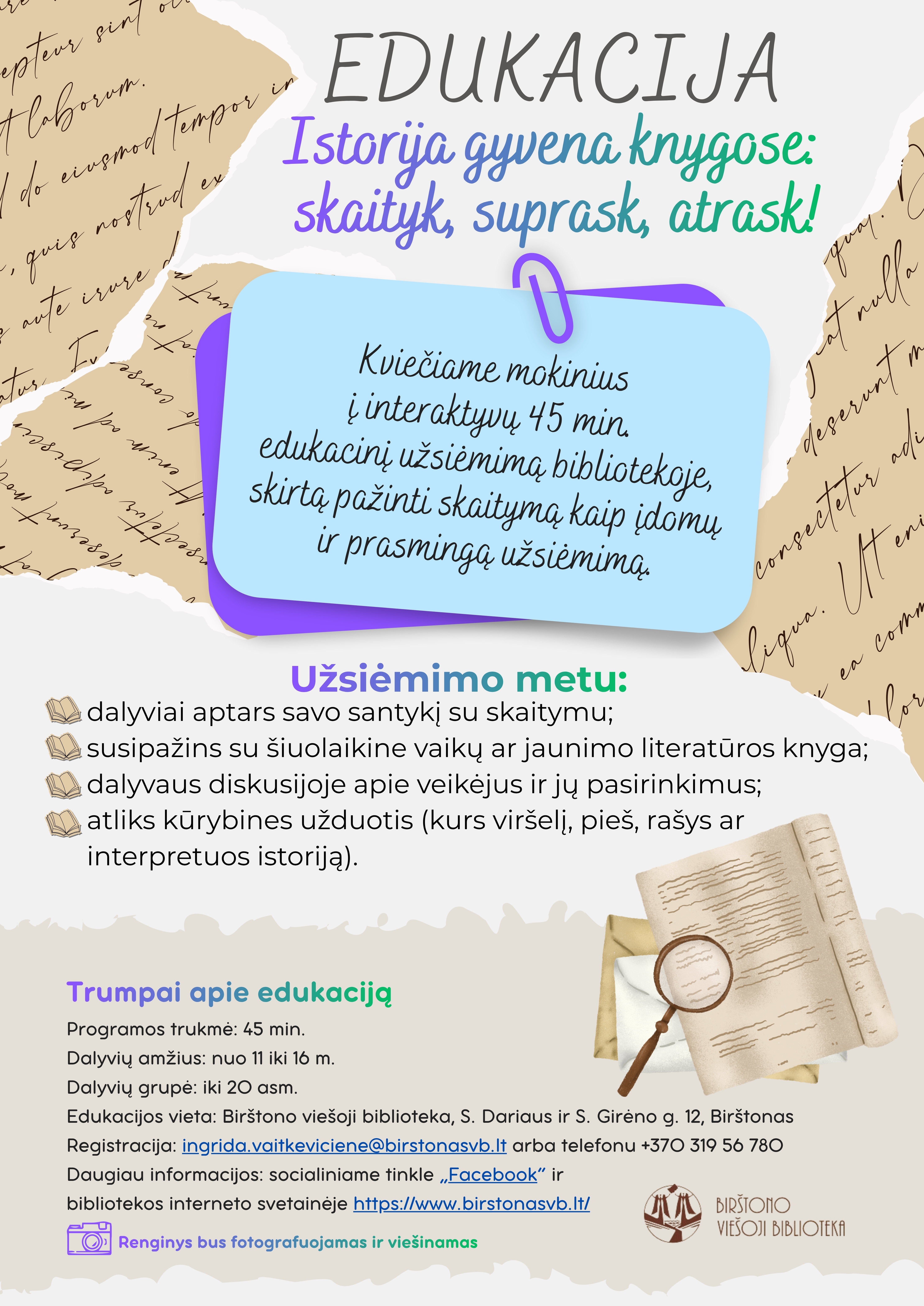 Edukacinė programa „Istorija gyvena knygose: skaityk, suprask, atrask“ siekia paskatinti mokinius pažvelgti į knygas kaip į įdomų ir prasmingą pažinimo būdą. Interaktyvios veiklos, diskusijos ir kūrybinės užduotys padeda mokiniams atrasti asmeninį santykį su literatūra, lavinti vaizduotę ir kritinį mąstymą.