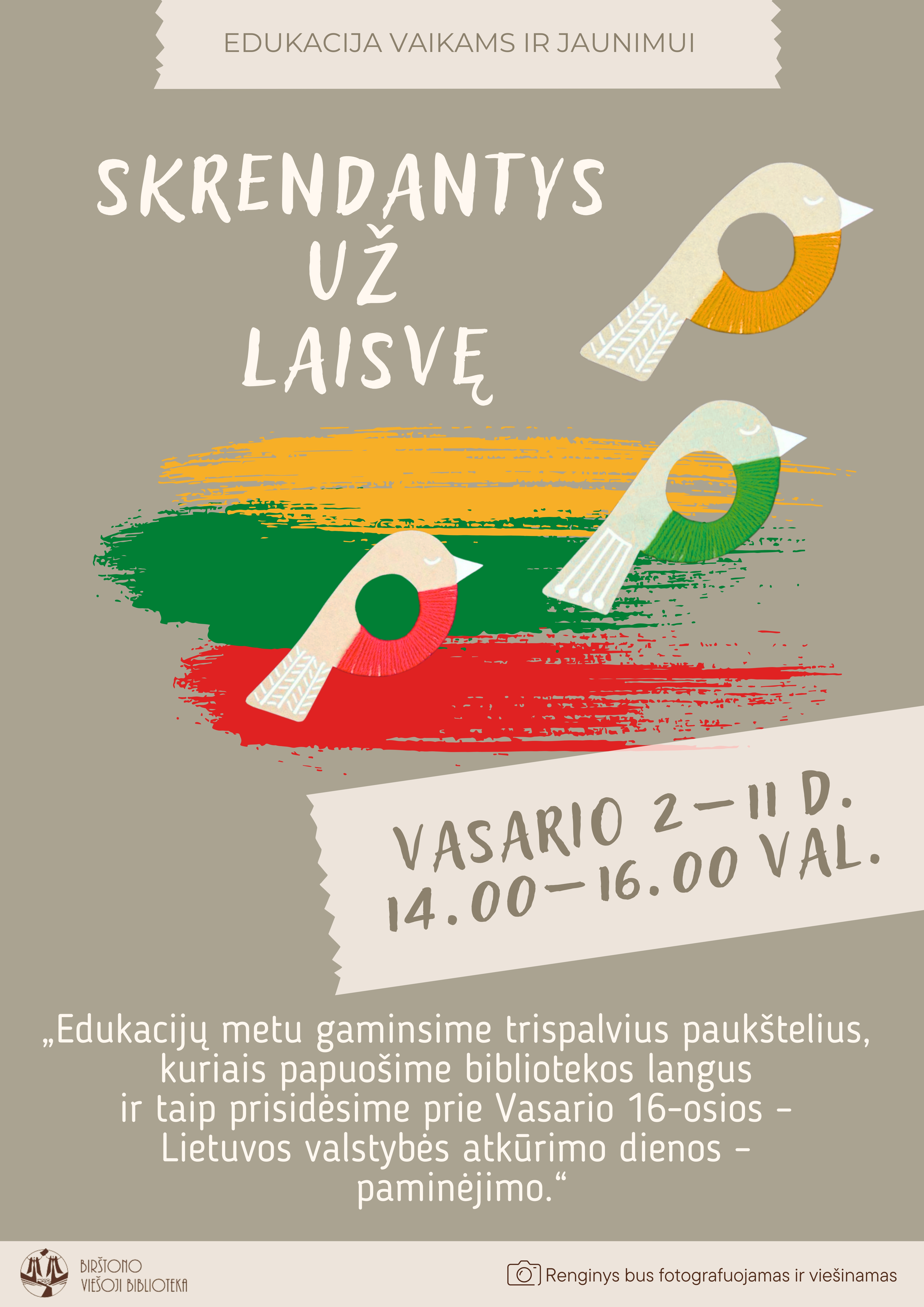 Edukacijos metu gaminsime trispalvius paukštelius, kuriais papuošime bibliotekos langus.