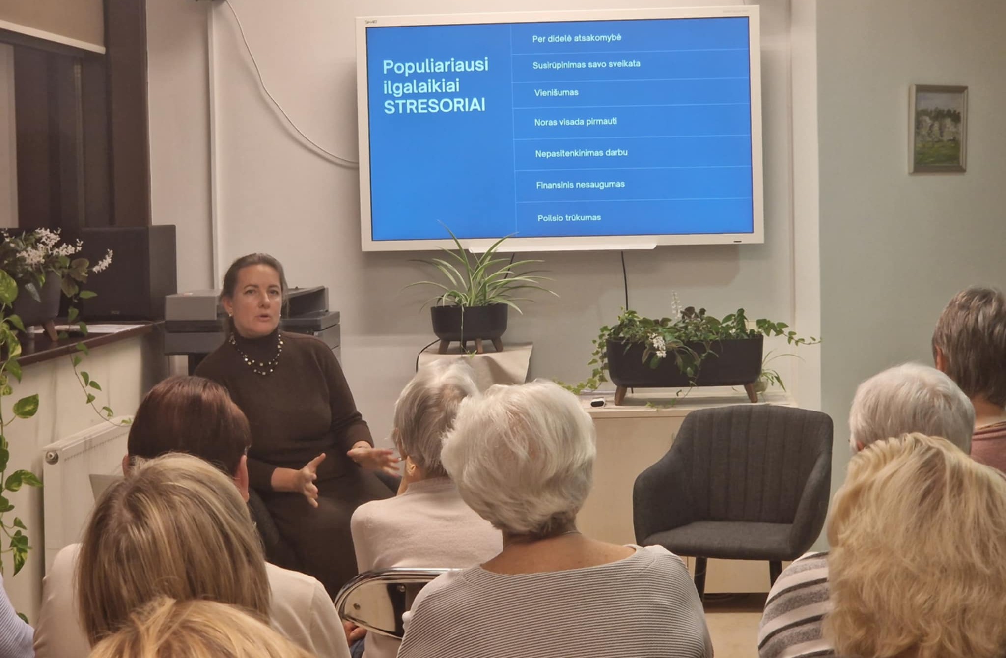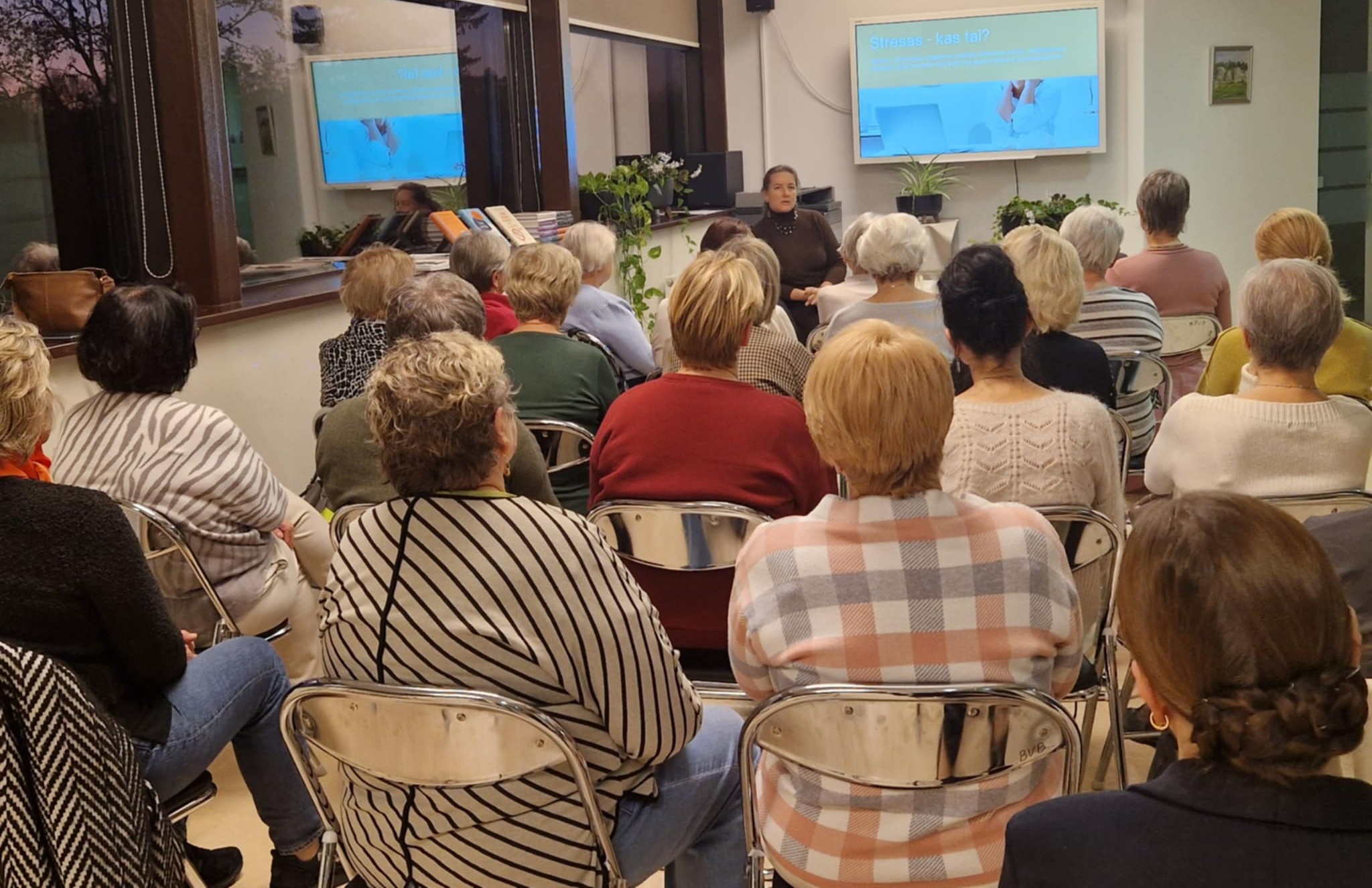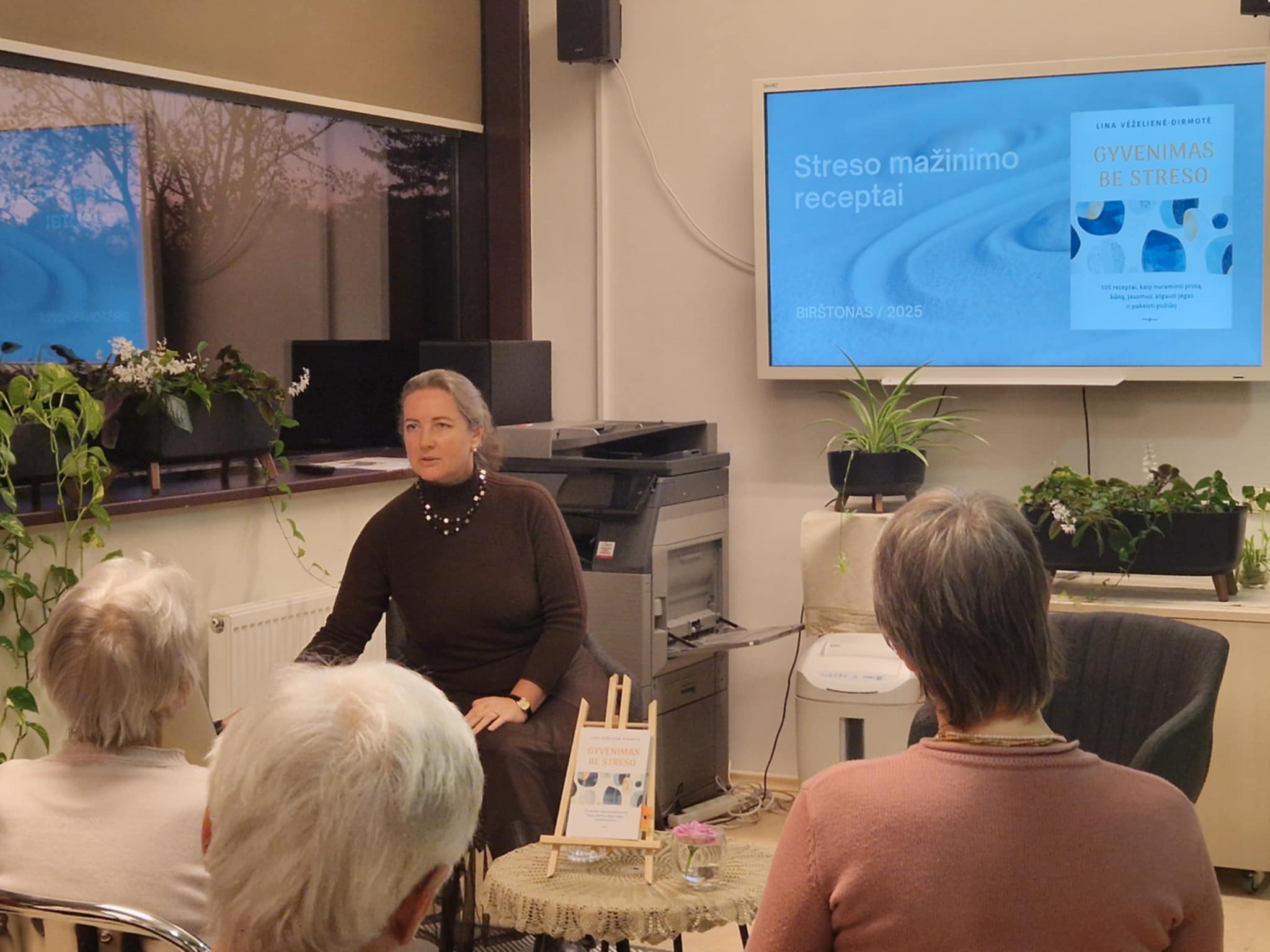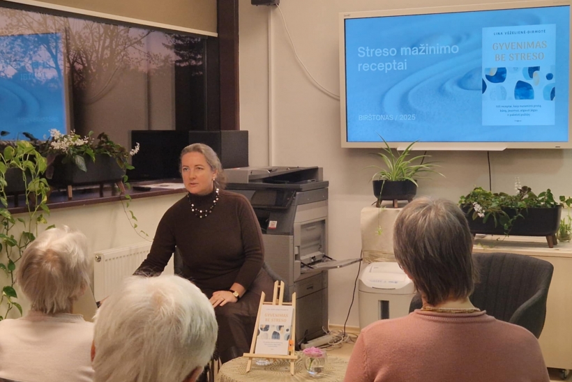 Lina Vėželiene Dirmotė apžvelgė kelis knygoje pateiktus, efektyvius streso mažinimo „receptus“, pritaikytus įvairioms situacijoms ir skirtingiems patiriamo streso intensyvumo lygiams, pasidalino praktiniais patarimais, kaip ugdyti savireguliacijos mechanizmą, išmokti valdyti savo emocijas, susidoroti su stresą sukeliančiomis problemomis. Susirinkusieji dalyvavo ir praktiniame užsiėmime, mokėsi nuraminti protą, jausmus, kūną.