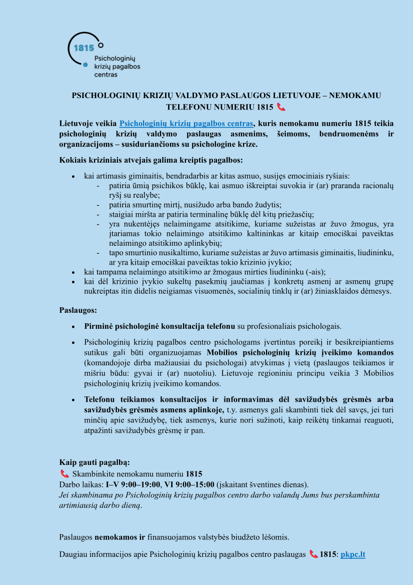 2025 12 11Informuojame, kad Higienos institutas (toliau –HI), įgyvendindamas HI nuostatų, patvirtintų Lietuvos Respublikos sveikatos apsaugos ministro 2012 m. gruodžio 11 d. įsakymu Nr. V-1142 ,,Dėl Higienos instituto nuostatų patvirtinimo” 10.4 papunktį, kuriame HI nustatyta viena iš veiklos sričių − plėtoti psichikos sveikatos stiprinimo, psichosocialinės pagalbos ir savižudybių prevencijos intervencijas, bei vadovaudamasis Psichologinių krizių valdymo paslaugų organizavimo tvarkos aprašu, patvirtintu Lietuvos Respublikos sveikatos apsaugos ministro 2021 m. gegužės 21 d. įsakymu Nr. V-1163 ,,Dėl psichologinių krizių valdymo paslaugų organizavimo tvarkos aprašo patvirtinimo“ (toliau – Aprašas), organizuoja Psichologinių krizių pagalbos centro (toliau – PKPC) nemokamo trumpojo Nr. 1815 ir Mobiliųjų psichologinių krizių įveikimo komandų (toliau – MPKĮK) paslaugų užtikrinimą Lietuvoje.