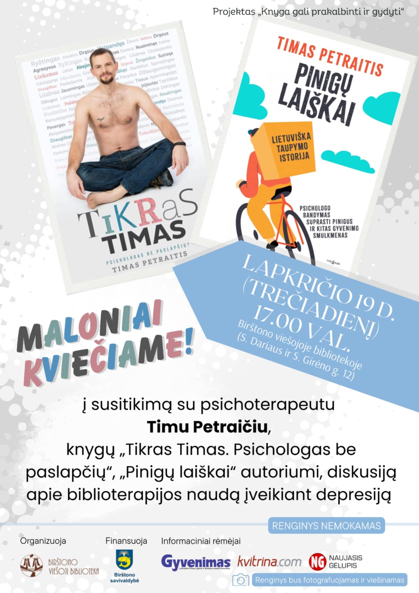 Kviečiame skaitytojus į diskusiją apie biblioterapijos naudą įveikiant depresiją. T. Petraitis, knygų „Tikras Timas. Psichologas be paslapčių“ ir „Pinigų laiškai“ autorius, yra aktyvus ir ilgametę praktinę patirtį sukaupęs psichoterapeutas, kurio įžvalgos nuolat sulaukia didelio dėmesio viešojoje erdvėje. Jo kūryba apima platų temų spektrą – nuo asmeninio augimo iki santykio su finansais. Susitikime jis pasidalins savo profesine įžvalga ir patarimais, pagrįstais realiu darbu su pacientais. Tai puiki proga giliau pažvelgti į tai, kaip tinkama literatūra gali tapti efektyvia priemone emocinei ir psichologinei gerovei stiprinti.