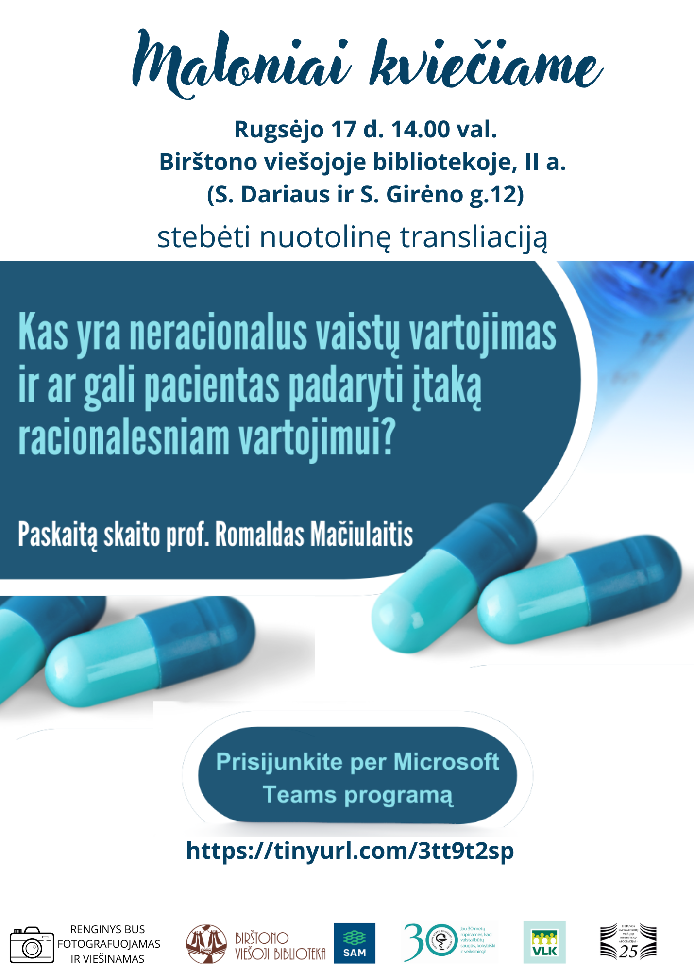 Rugsėjo 17 d. 14.00 val. Sveikatos apsaugos ministerija kviečia nutolinę paskaitą „Kas yra neracionalus vaistų vartojimas ir ar gali pacientas padaryti įtaką racionalesniam vartojimui?“. Paskaitą skaitys ir į Jūsų klausimus atsakys Valstybinės ligonių kasos atstovas profesorius Romaldas Mačiulaitis.