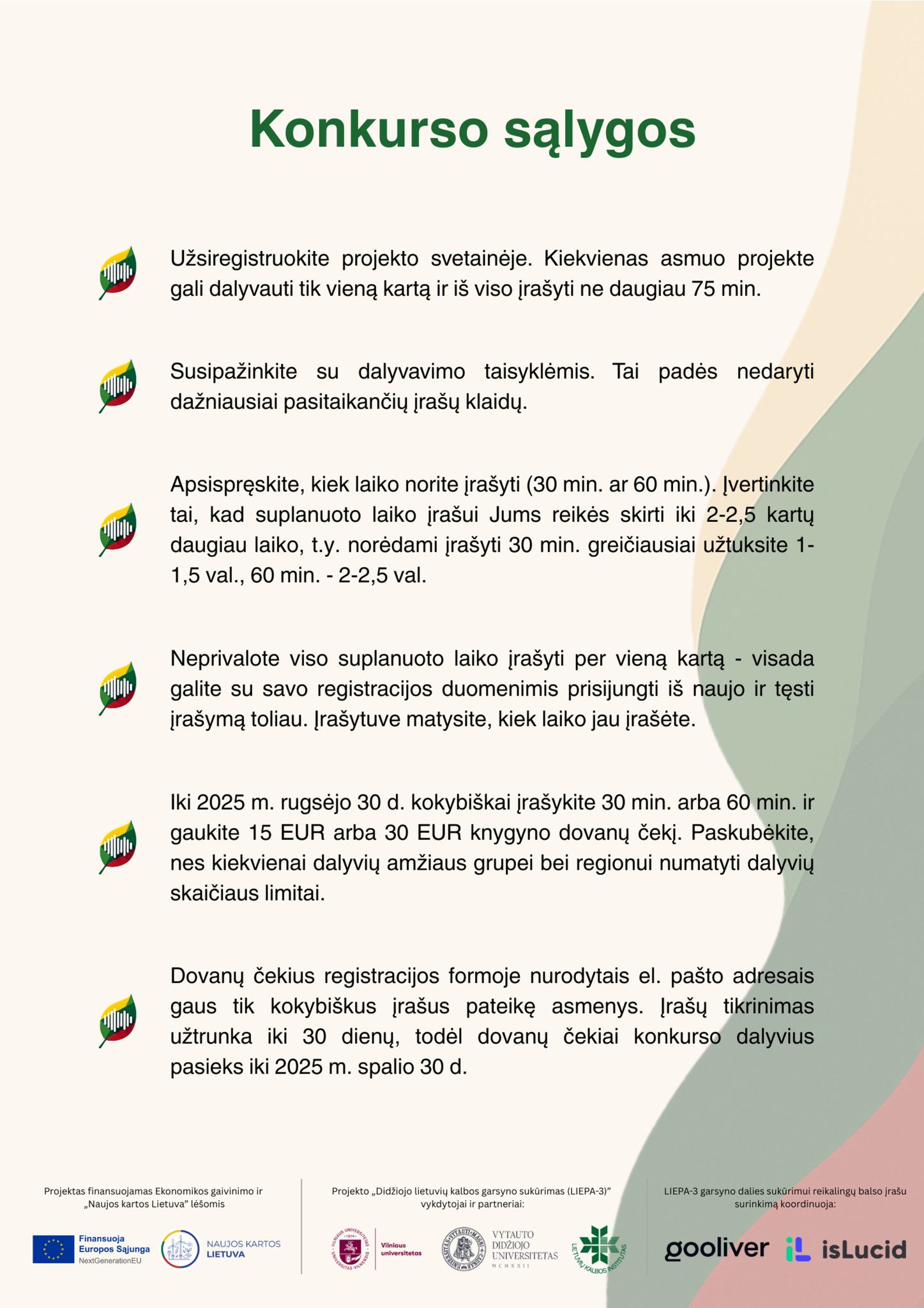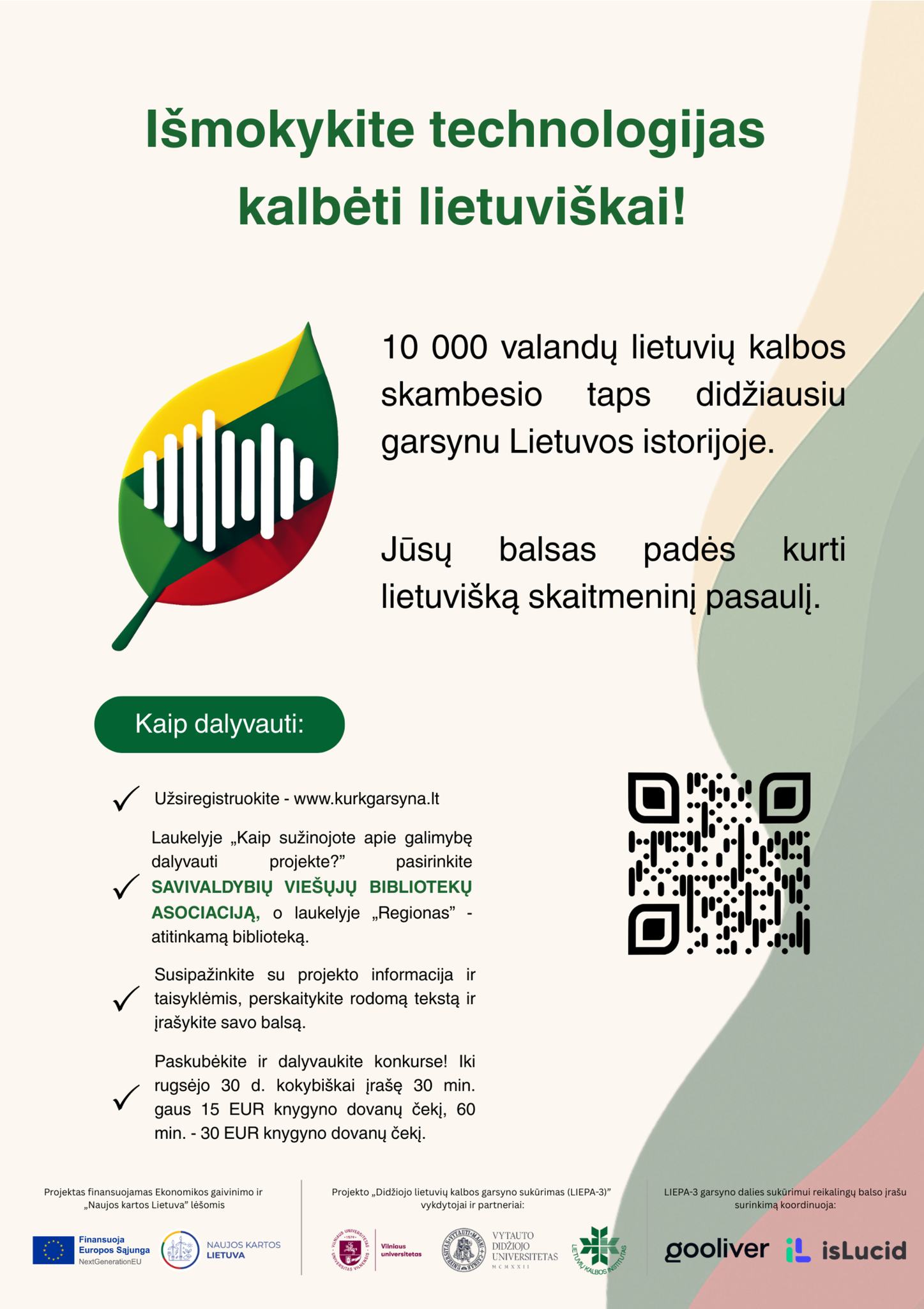 Kviečiame prisidėti prie Didžiojo lietuvių kalbos garsyno sukūrimo! Sukurtas garsynas padės technologijoms mokytis kalbėti lietuviškai. Balso įrašai bus naudojami kuriant šnekos atpažinimo sistemas, dirbtinį intelektą ir inovatyvius skaitmeninius sprendimus.