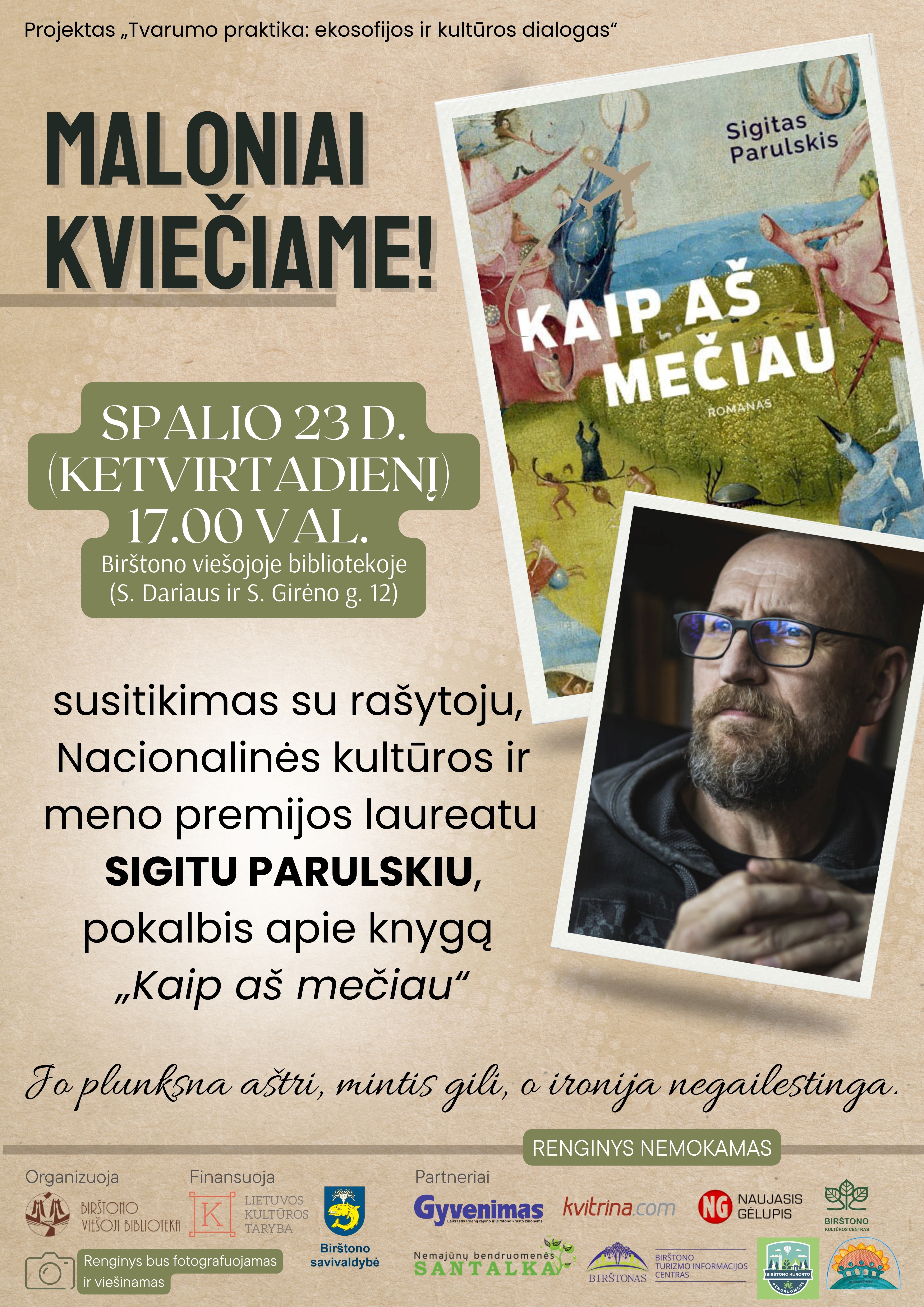 Maloniai kviečiame spalio 23 d. (ketvirtadienį) 17.00 val. Birštono viešojoje bibliotekoje (S. Dariaus ir S. Girėno g. 12) į Sigito Parulskio, rašytojo, Nacionalinės kultūros ir meno premijos laureato, knygos „Kaip aš mečiau“ pristatymą. Tai projekto „Tvarumo praktika: ekosofijos ir kultūros dialogas“ renginys, kuriuo siekiama praplėsti vietos bendruomenių kultūrines, bendrąsias, tapatumo (pozityvaus mąstymo, tvarumo ir kt.) kompetencijas.