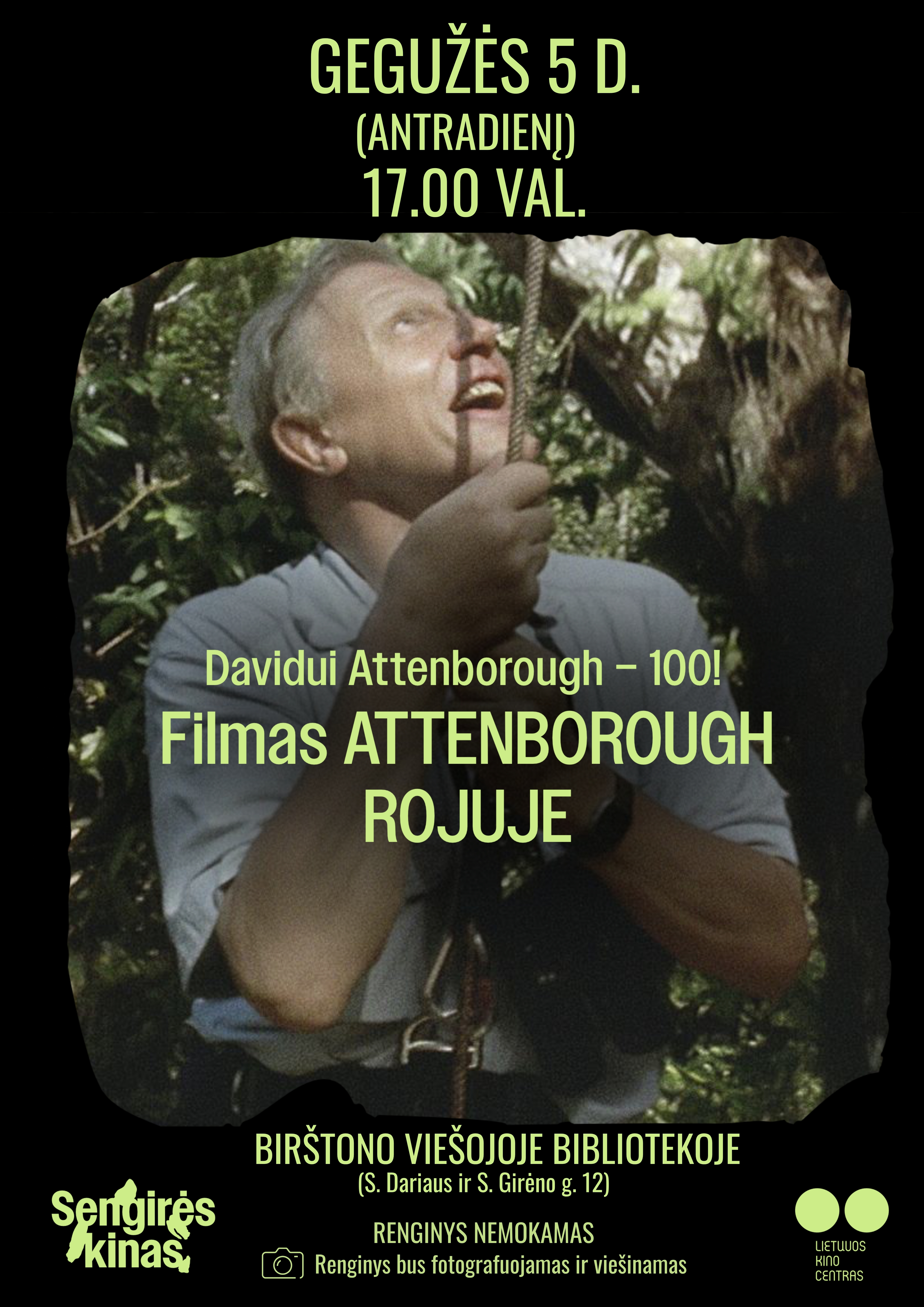 Kiną ir aplinkosaugą jungiantis projektas „Sengirės kinas“ kviečia į filmo peržiūrą Birštono viešojoje bibliotekoje. Gegužės 5 d. 17.00 val. bus rodomas dokumentinis filmas „Attenborough rojuje“.