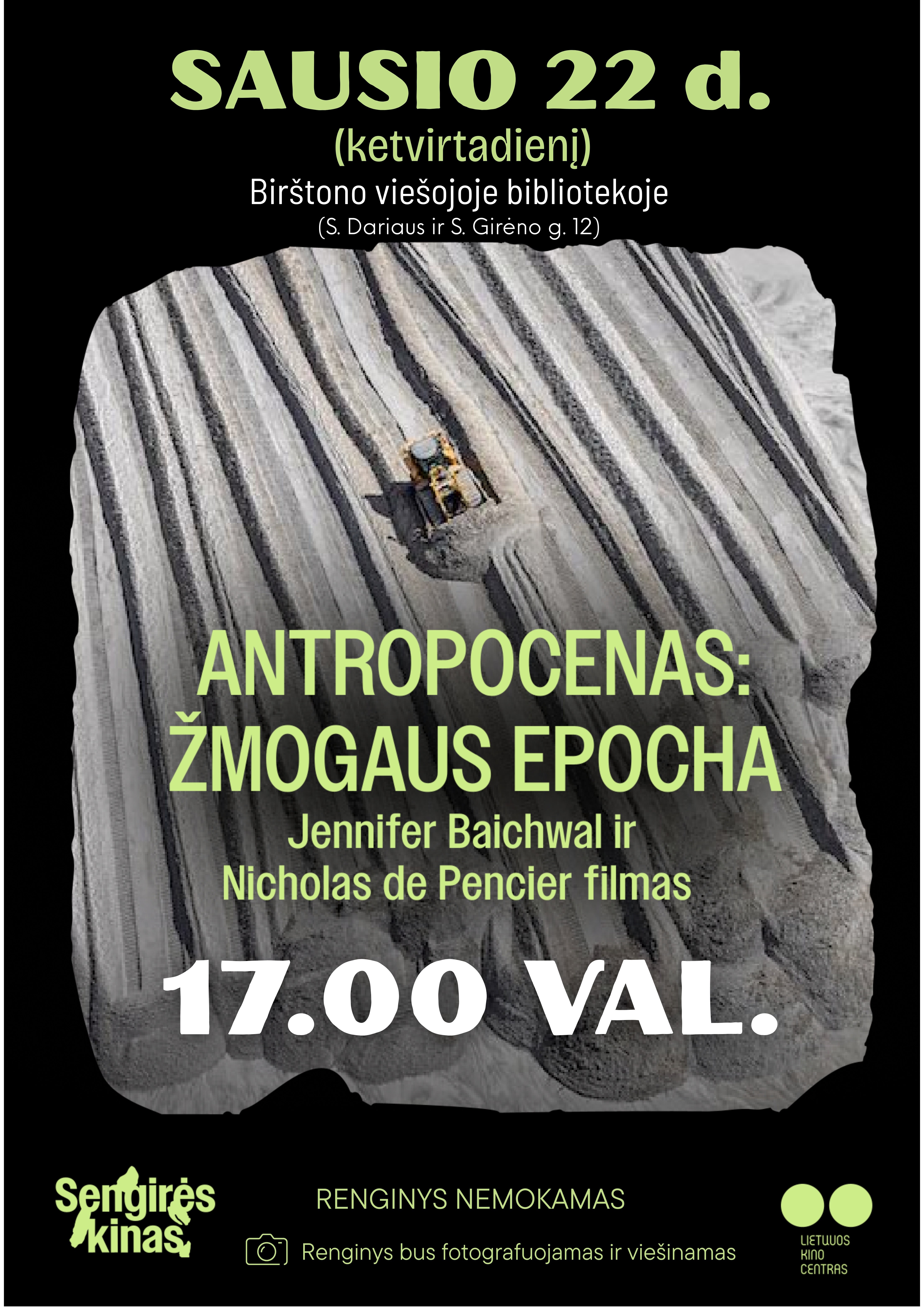 Sausio 19–25 dienomis projekto partnerių tinkle, apimančių arti 100 ekranų, bus rodomas kanadiečių filmas „Antropocenas: žmogaus epocha“ (rež. Jennifer Baichwal, Nicholas de Pencier ir Edward Burtynsky) – tai vizualiai įspūdingas dokumentinis filmas, kuriame kelionė per planetą atskleidžia, kaip žmogaus veikla per pastarąjį amžių pakeitė Žemės paviršių, klimatą ir ekosistemas. Filmas yra trečioji garsios kūrėjų trijulės kurtos trilogijos apie Žemę, dalis, kurioje nagrinėjama naujo geologinio laikotarpio – antropoceno – koncepcija ir jos reikšmė žmogaus istorijai bei ateičiai. Šis meditatyvus kino dokumentas pristato įspūdingus vaizdus iš skirtingų Žemės kampelių, priversdamas susimąstyti apie mūsų pėdsaką planetoje. Filmą pristato paleontologė dr. Simona Bekeraitė. Sausio 22 d. 17:00 filmą kviečiame žiūrėti Birštono viešojoje bibliotekoje.