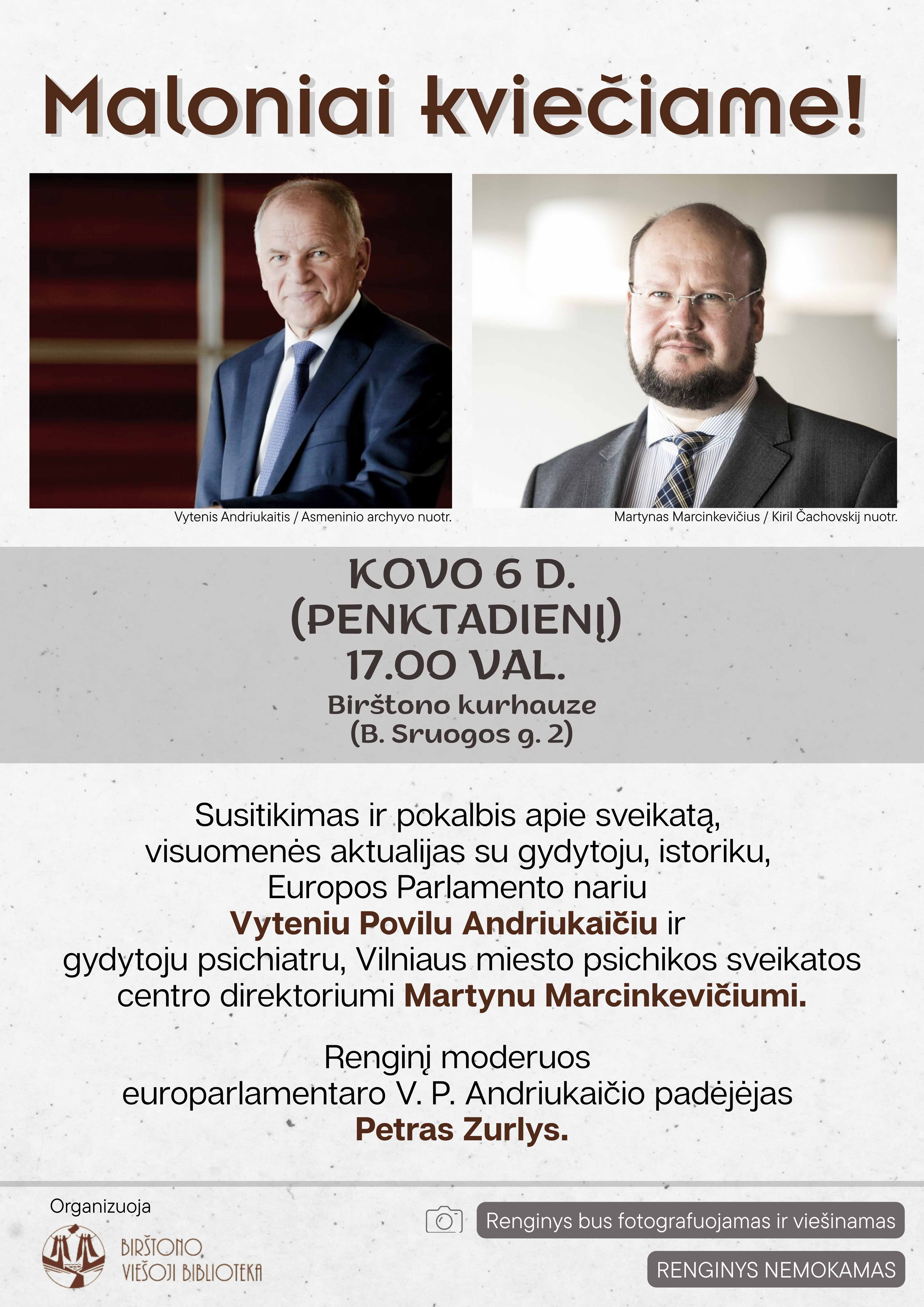 Šių metų kovo 6 d. (penktadienį), 17.00 val., Birštono kurhauze (B. Sruogos g. 2) rengiamas susitikimas-pokalbis, skirtas aptarti svarbius sveikatos apsaugos klausimus bei šiandienines visuomenės aktualijas. Renginyje dalyvaus ir savo įžvalgomis dalinsis du pripažinti savo sričių profesionalai: Vytenis Povilas Andriukaitis ir Martynas Marcinkevičius.
