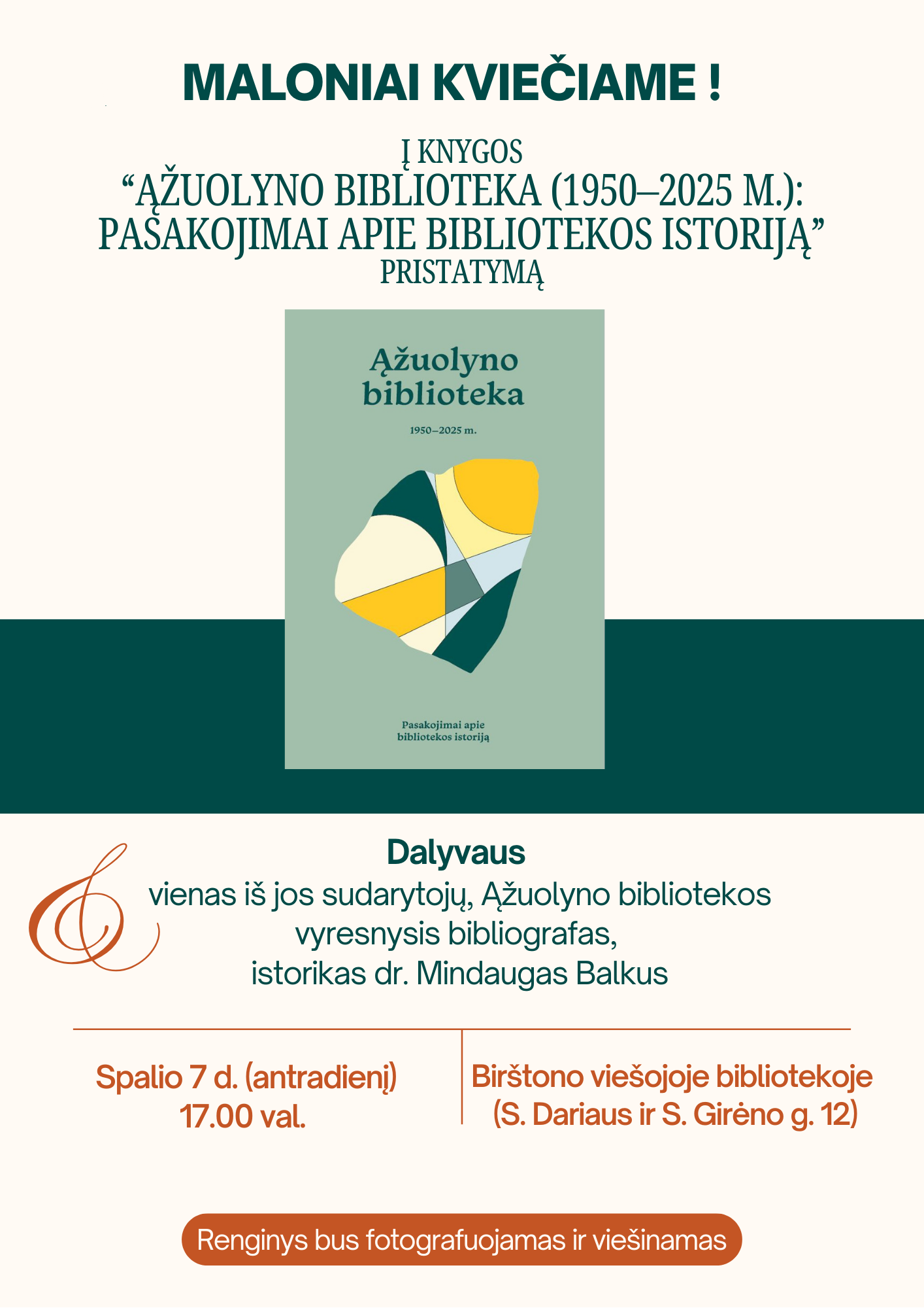 Kviečiame į knygos „Ąžuolyno biblioteka (1950–2025 m.): pasakojimai apie bibliotekos istoriją“ pristatymą, kuris vyks spalio 7 d. 17.00 val. Birštono viešojoje bibliotekoje (S. Dariaus ir S. Girėno g. 12, Birštonas). Knygą pristatys vienas iš jos sudarytojų, Ąžuolyno bibliotekos vyresnysis bibliografas, istorikas dr. Mindaugas Balkus.