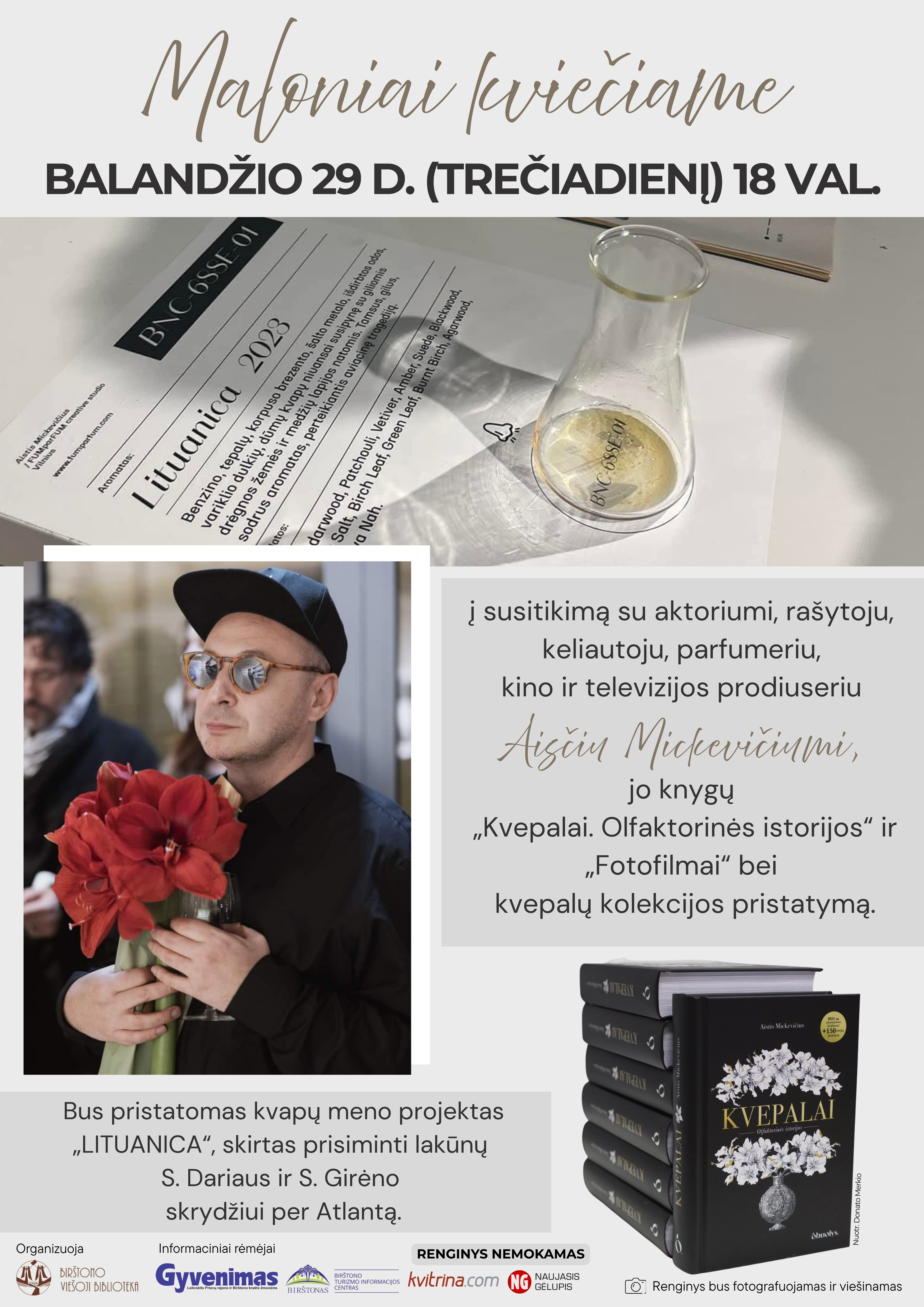 Balandžio 29 d. 19.00 val. bibliotekoje lankysis Aistis Mickevičius – vienas universaliausių šiuolaikinių Lietuvos kūrėjų: aktorius, keliautojas, kvapų ir vizualinis menininkas, parfumeris, autorinės parfumerijos kūrėjas, kino ir televizijos prodiuseris, knygų autorius. Aistis neapsiriboja viena meno sritimi – jo kūryba laisvai juda tarp skirtingų disciplinų, ieškodama gyvo, autentiško patyrimo.