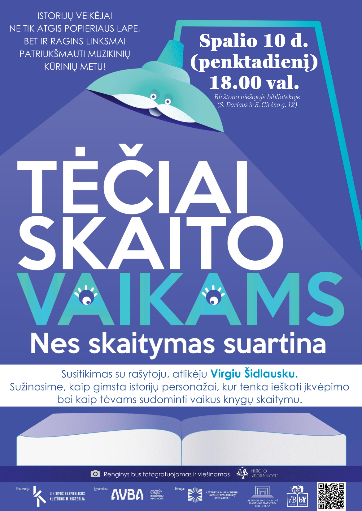Spalio 10 d., 18.00 val. kviečiame į susitikimą su rašytoju, atlikėju Virgiu Šidlausku. Susitikimo metu sužinosite, kaip gimsta istorijų personažai, kur tenka ieškoti įkvėpimo bei kaip tėvams sudominti vaikus knygų skaitymu.