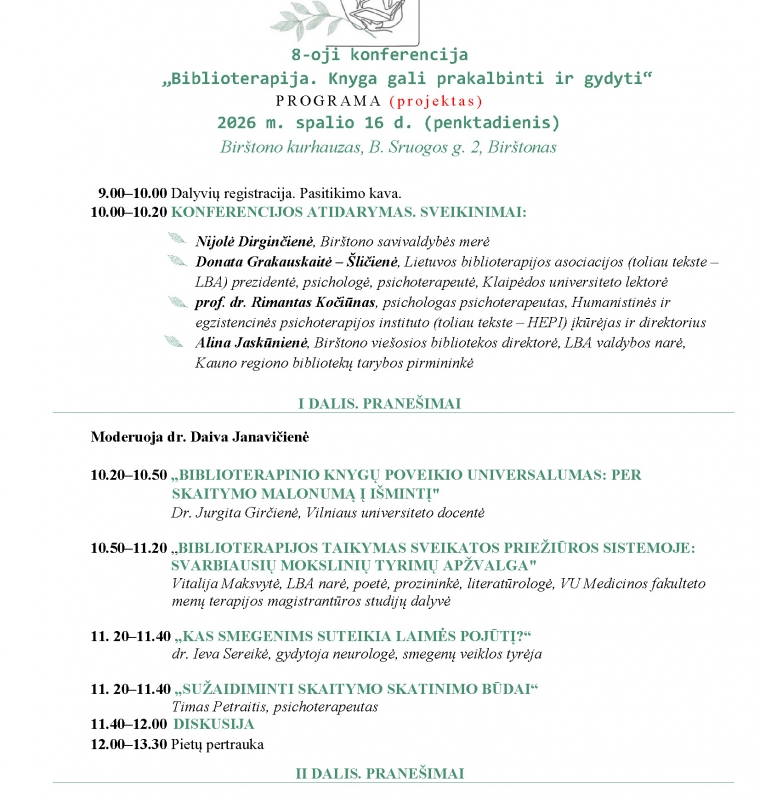 10.50–11.20 „BIBLIOTERAPIJOS TAIKYMAS SVEIKATOS PRIEŽIŪROS SISTEMOJE: SVARBIAUSIŲ MOKSLINIŲ TYRIMŲ APŽVALGA"