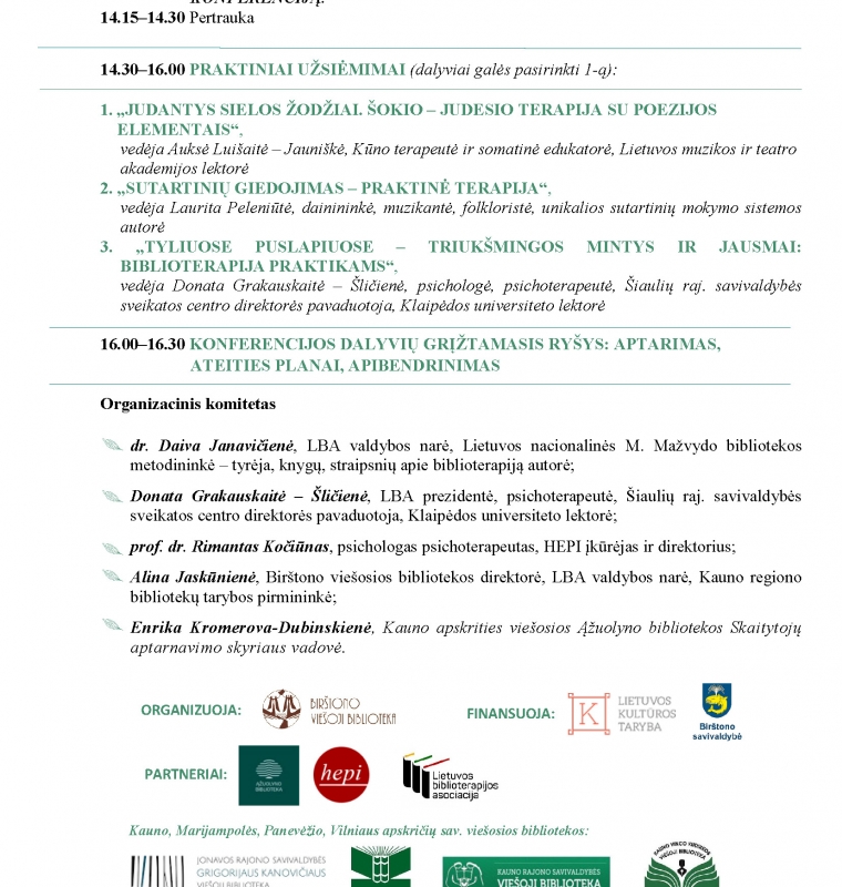 13.30–13.45 „BIBLIOTERAPIJOS PATIRTIS ROKIŠKIO JUOZO KELIUOČIO VIEŠOJOJE BIBLIOTEKOJE: VEIKLOS PROJEKTE „SOCIALINĘ ĮTRAUKĄ SKATININANČIOS BIBLIOTEKOS“ (INTERREG LATVIJA – LIETUVA)