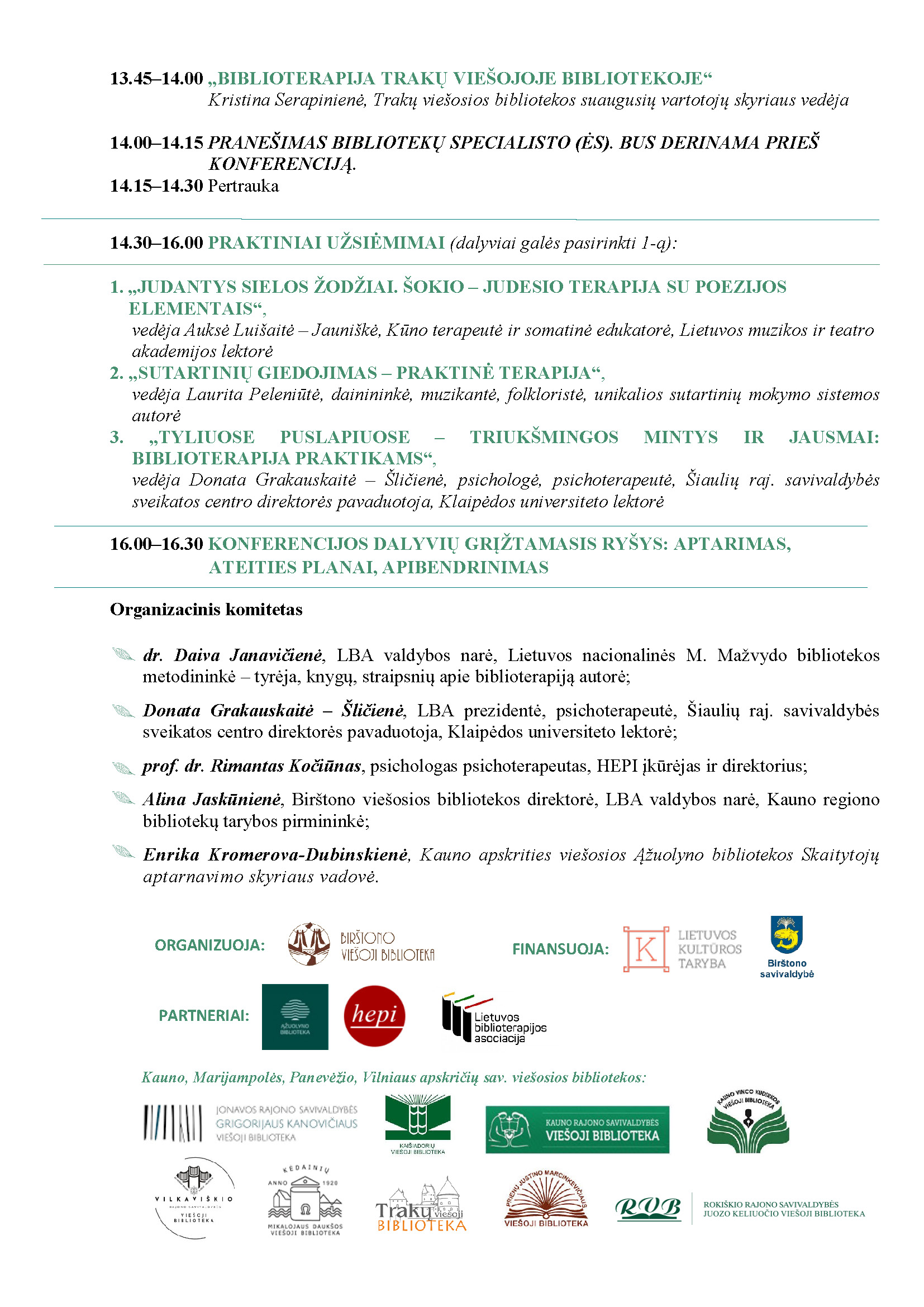 13.45–14.00 „BIBLIOTERAPIJA TRAKŲ VIEŠOJOJE BIBLIOTEKOJE“