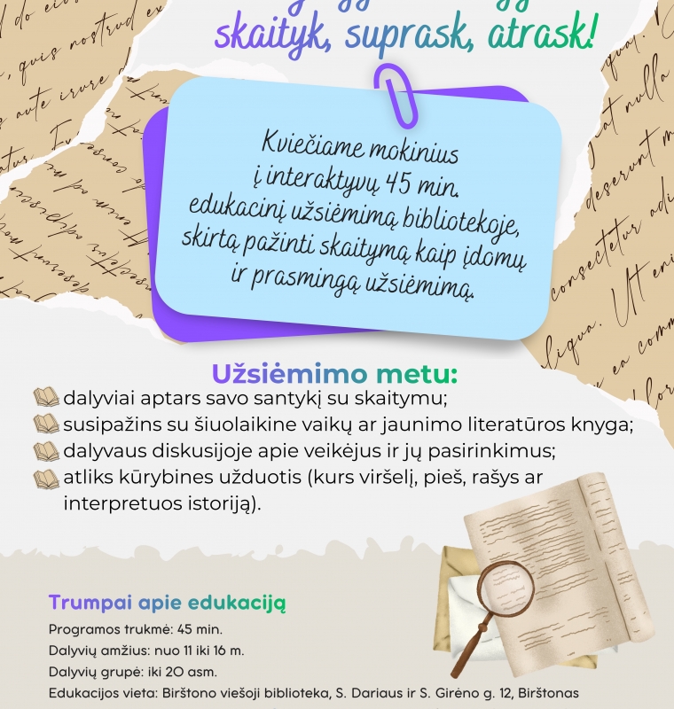 Edukacinė programa „Istorija gyvena knygose: skaityk, suprask, atrask“ siekia paskatinti mokinius pažvelgti į knygas kaip į įdomų ir prasmingą pažinimo būdą. Interaktyvios veiklos, diskusijos ir kūrybinės užduotys padeda mokiniams atrasti asmeninį santykį su literatūra, lavinti vaizduotę ir kritinį mąstymą.