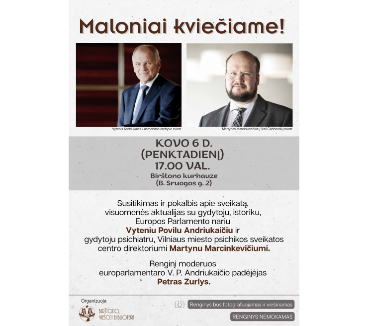 Rengiamas susitikimas-pokalbis, skirtas aptarti svarbius sveikatos apsaugos klausimus bei šiandienines visuomenės aktualijas. Renginyje dalyvaus ir savo įžvalgomis dalinsis du pripažinti savo sričių profesionalai: Vytenis Povilas Andriukaitis ir Martynas Marcinkevičius.
